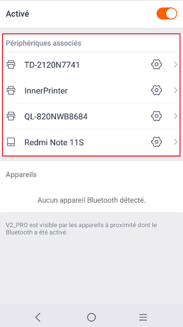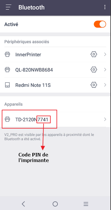 L'imprimante apparaît comme détectée mais pas associée. On remarquera les 4 chiffres à la fin du nom de l'imprimante. Ces 4 chiffres sont le Code PIN pour appairer l'imprimante à la tablette. |