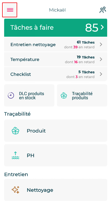 Rendez-vous sur l'application HACCP. Cliquer sur le menu "Mon Compte" en haut à gauche. |