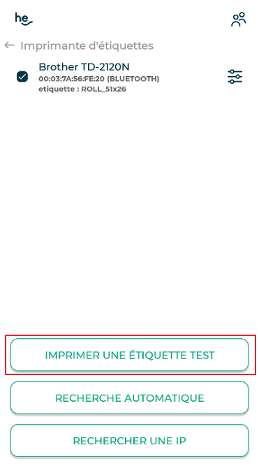 Appuyer sur l'option "Imprimer une étiquette test" pour s'assurer de la bonne liaison et du bon fonctionnement entre l'imprimante et l'application.