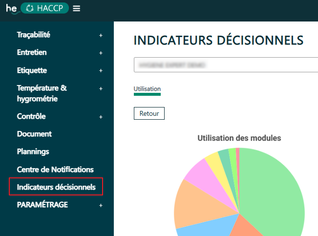 Vous pouvez consulter les indicateurs décisionnels, statistiques qui vous permettront d'influencer les choix et à orienter les actions à mener, en cliquant sur le lien disponible depuis le menu latéral de gauche de l'application.