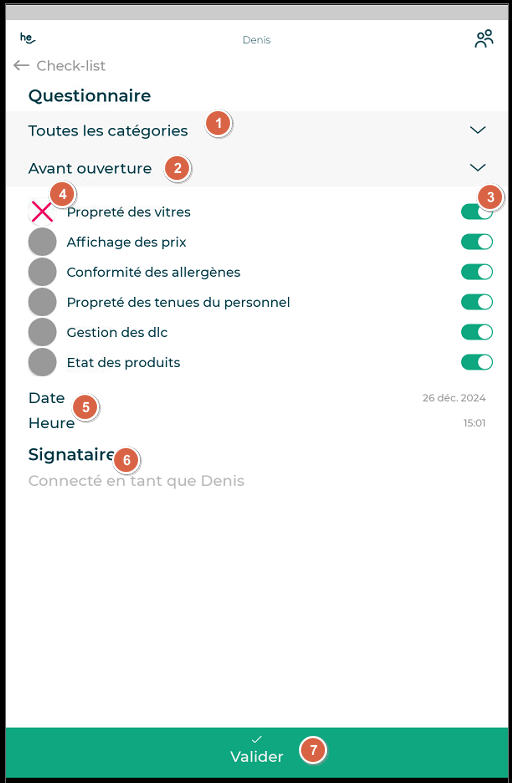1. Sélectionner une catégorie de questionnaire. 2. Sélectionner ensuite un questionnaire. 3. Valider la conformité des différentes questions 4. En cochant l'image de la question (appui sur le cercle), vous pouvez mettre la question en Non Applicable - N/A. Elle n'apparaîtra pas sur l'historique après validation de cette checklist 5. Indiquer la date/heure. 6. Le signataire est sélectionné dès le début. 7. Valider la check-list.