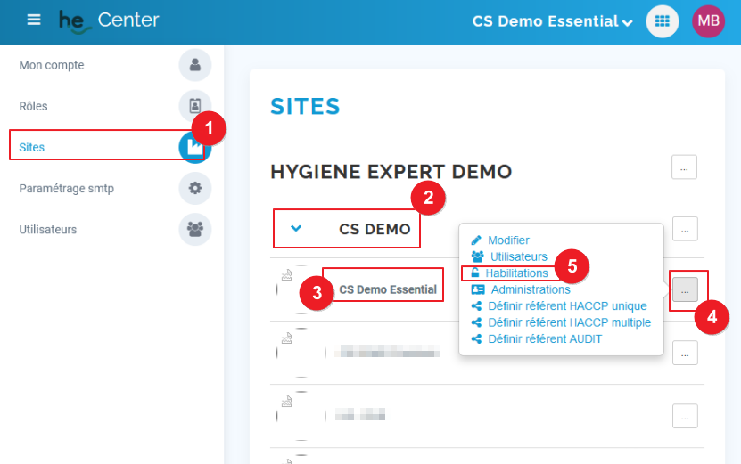 | Depuis votre outil "HE CENTER", sélectionnez "Sites" (1). L'arborescence s'ouvre. Depuis votre groupe (2), dépliez les sites (3). Sur le site à paramétrer, cliquez sur le bouton d'accès |