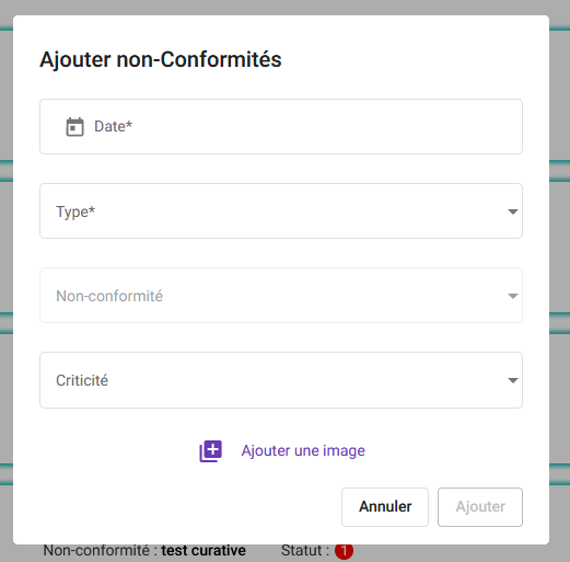 Compléter alors le formulaire de déclaration d'ajout de non conformité. En fonction des types de non-conformité que vous avez préalablement paramétrés, vous pourrez sélectionner un type et sa non conformité. Vous aurez également la possibilité de déclarer une criticité parmi les 3 propositions suivantes : - Mineur - Majeur - Majeur DO (Majeur Déclaration Obligatoire) |