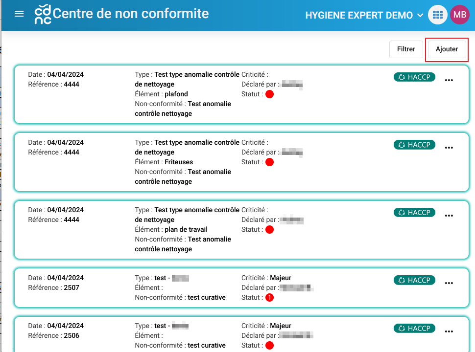 | Depuis la liste des anomalies déclarées, cliquez sur le bouton "Ajouter" en haut à droite pour créer une nouvelle anomalie. |