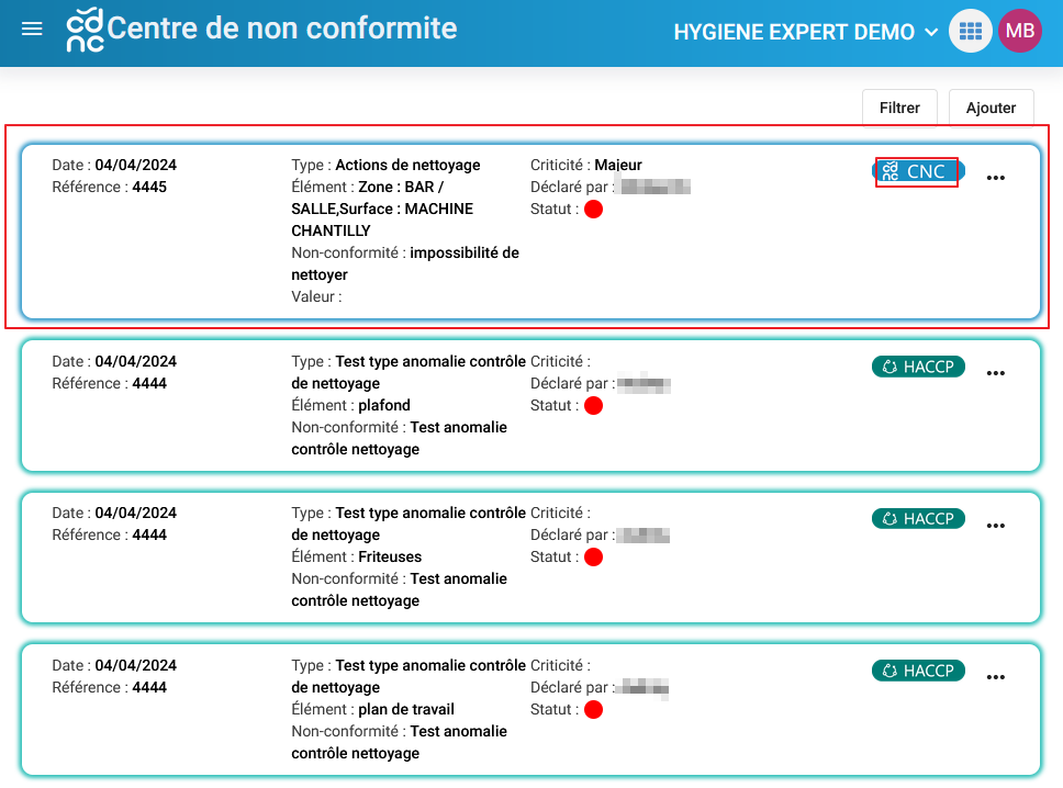 | La non-conformité viendra se rajouter alors à la liste de vos précédentes déclarations. Celle-ci comporte le logo CNC |
