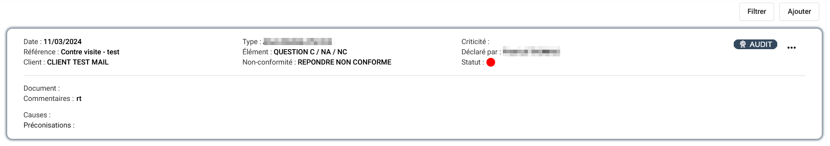 | Lors d'un audit, si une non-conformité a été déclarée, celle-ci apparaitra dans la liste des non-conformités avec un logo |
